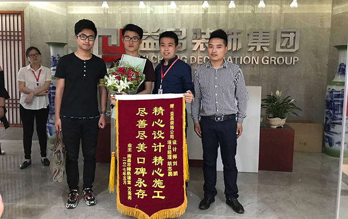 “盡善盡美口碑永存,精心設(shè)計(jì)精心施工”這是對(duì)益昌裝飾最大的肯定,是全體益昌人努力的最強(qiáng)動(dòng)力。唐先生表示,新店裝修的這段時(shí)間,設(shè)計(jì)師們的定制設(shè)計(jì),施工團(tuán)隊(duì)的敬業(yè)付出,真正做到了省時(shí)、省心、省力,這面錦旗包含了他對(duì)益昌裝飾的肯定與感謝!
