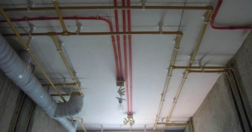 A、為抗干擾強(qiáng)、弱電布線嚴(yán)禁同槽、同管、同底盒出線; B、當(dāng)金屬線管與金屬盒箱連接時(shí)與保護(hù)地線(PE線)連接。 3、配管:天花板敷設(shè)線管